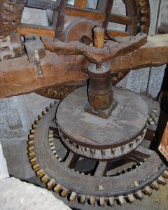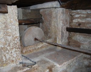 Per una corretta molitura le macine devono essere periodicamente ribattute in modo da ripristinare i canali e le superfici corrotti; per fare questo ci si serve di martelli e scalpelli che, per lavorare con precisione, vengono affilati sulla mola in oggetto. La rotazione viene da un ingranaggio solidale all’albero della mola, collegato direttamente allo scudo.