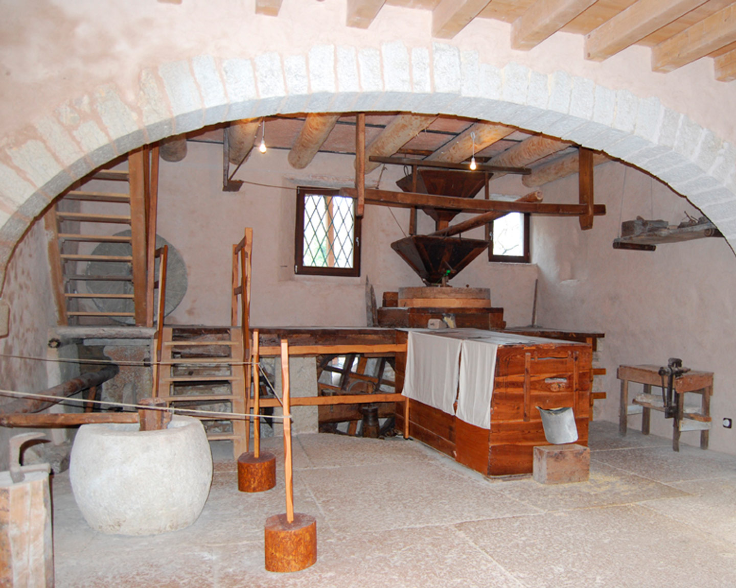 Il locale di molitura, di 6.80 per 5.30 metri, è attraversato da un arco a tutto sesto ribassato che ha funzione portante per tutto l’edificio. Addossato alla parete nord-est, retrostante la ruota, è presente l’insieme di ingranaggi che permette il moto della mola e degli attrezzi accessori, quali il setaccio della farina, la piccola mola per affilare e il pestello per la pilatura delle granaglie. Sulle altre tre pareti, o addossati ad esse, sono presenti tutti gli strumenti ed attrezzi utilizzati dal mugnaio: setacci, martelli e scalpelli, contenitori di varie forme, misure e materiali, cavalletti e treppiedi.