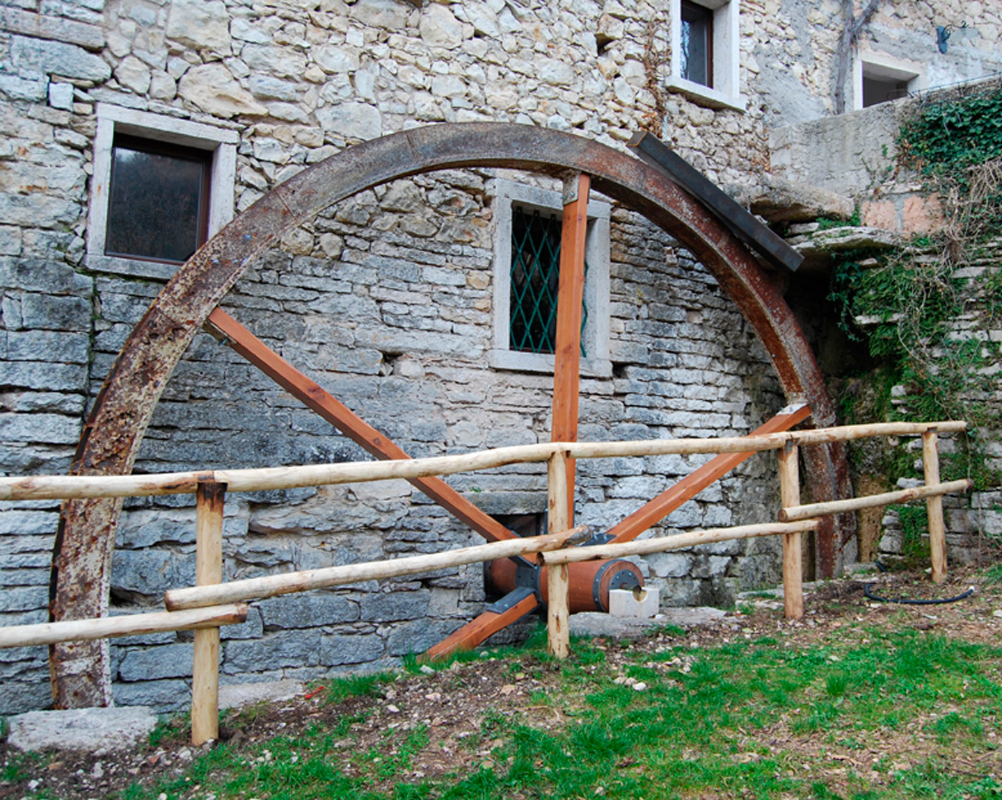 La grande ruota ha un diametro di 6.50 metri, ed è costruita con legno di larice per i raggi (ronghe) e con ferro per le tazze (copi) che raccolgono l’acqua proveniente dalla canaletta in pietra, alimentata dalla fontana dei Veraghi. Mediante il fuso (mas-cio) in acciaio e legno di rovere, la ruota è sostenuta e imperniata al castello di ingranaggi all’interno della sala di macinatura. L’acqua viene convogliata sulla ruota da una doccia (sbolsa), incernierata a monte alla canaletta; un sistema di cavi, carrucole e catene all’interno della struttura permette di regolare la caduta dell’acqua nelle tazze oppure lateralmente alla ruota.
